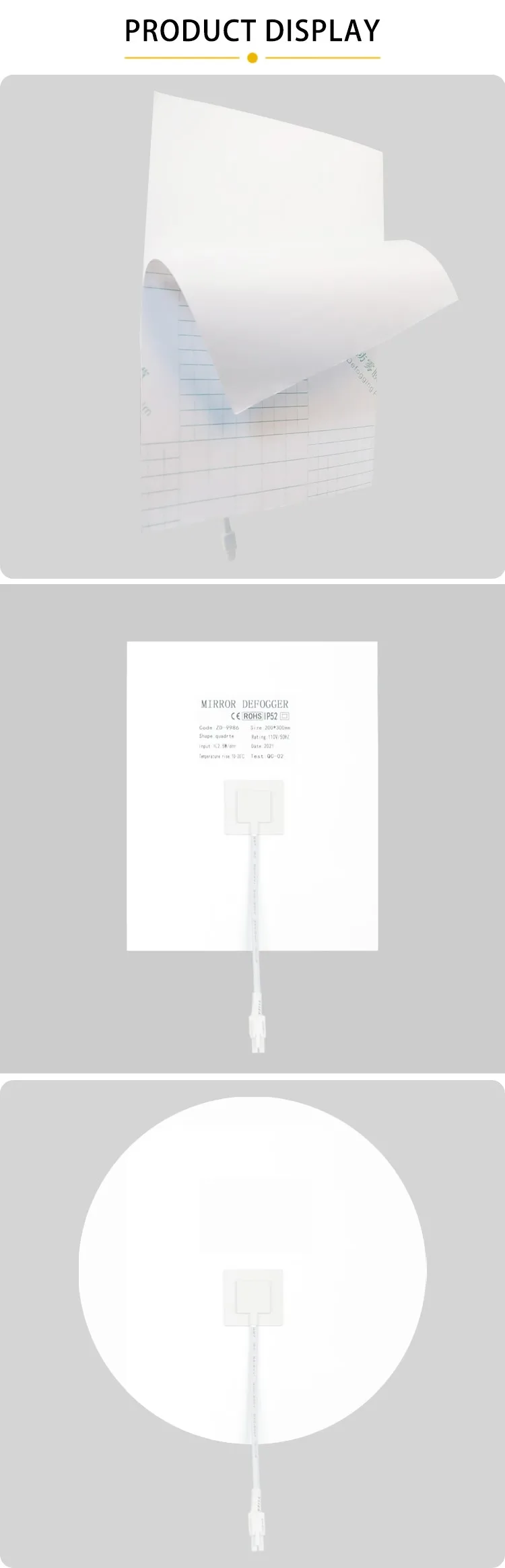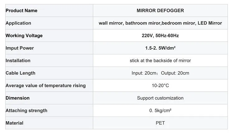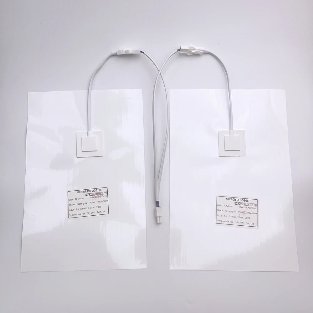 Os desembaçadores de espelho são almofadas térmicas adesivas instaladas na parte traseira do espelho. Eles fornecem energia térmica, que é transferida diretamente para o espelho, resultando no aquecimento da superfície. Isso elimina o embaçamento. Sua potência específica mantém o espelho aquecido a uma temperatura confortável e previne eficazmente a condensação de vapor de água na superfície, deixando o espelho sem embaçamento.